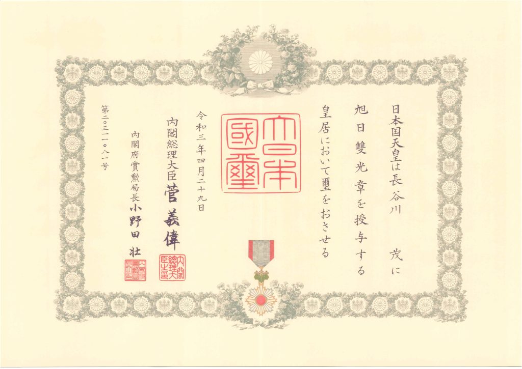 2021年4月29日、当社名誉会長 長谷川 茂が 内閣総理大臣より旭日双光章を授与されました。